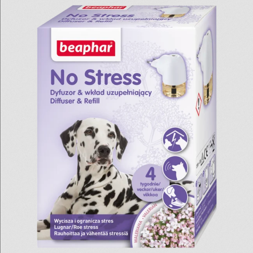 No Stress diffusor reduserer atferdsproblemer hos hund av alle raser, alder og størrelse utløst av stress situasjoner. 1 flaske (30ml.) varer 4 uker ved kontinuerlig bruk. Diffusoren er ideell i situasjoner som: