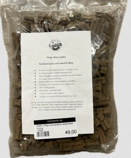 Bellfor 500gr prøvepakke kaldpresset Kylling er et fôr til hund.