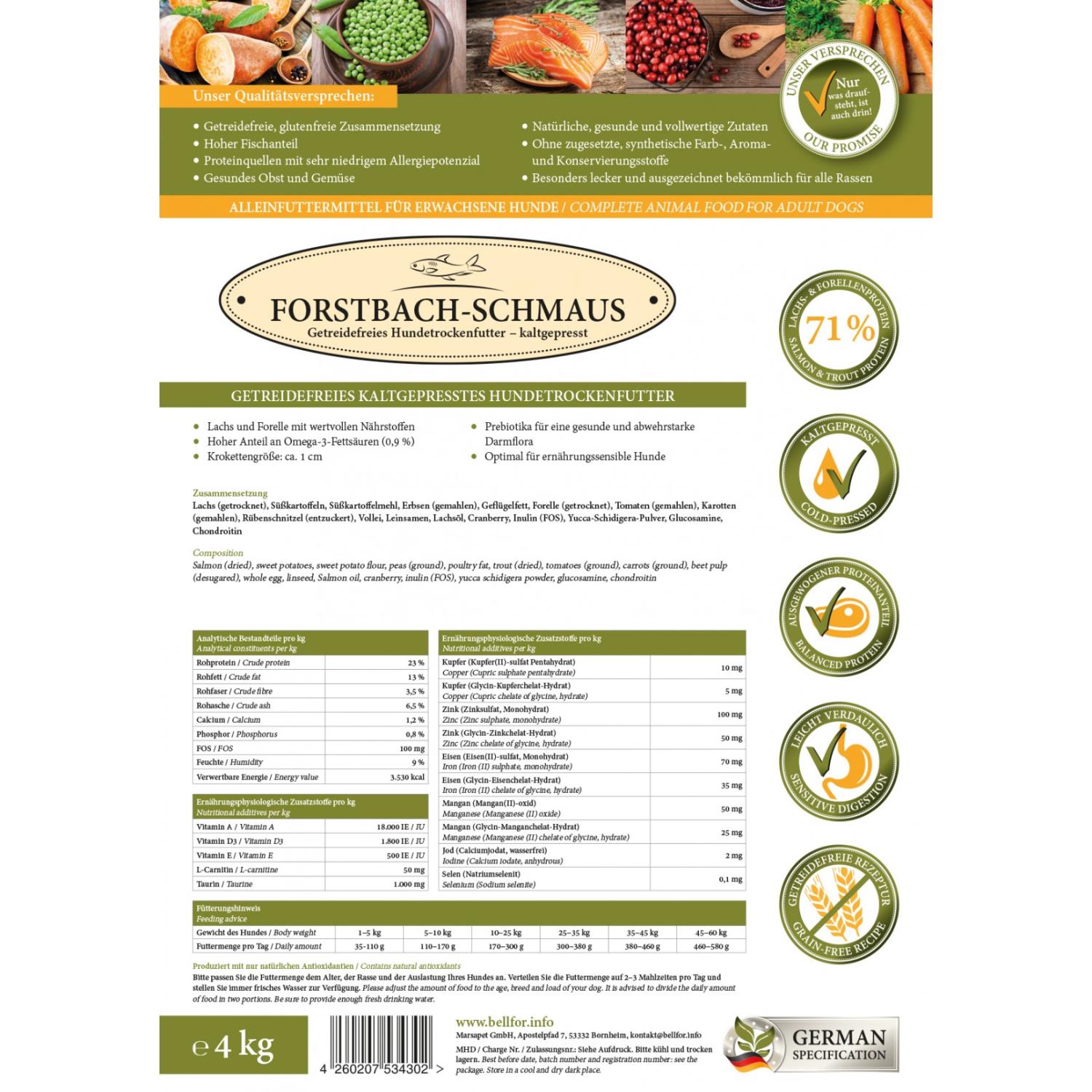 Bellfor Wildbach-Schmaus er et kaldpresset tørrfôr basert på laks og ørret av matkvalitet, uten kjøttavfall eller kunstige tilsetninger. Hele 71 % av oppskriften består av fersk fisk (52,5 % laks og 18,5 % ørret), supplert med nøye utvalgte plantebaserte ingredienser.