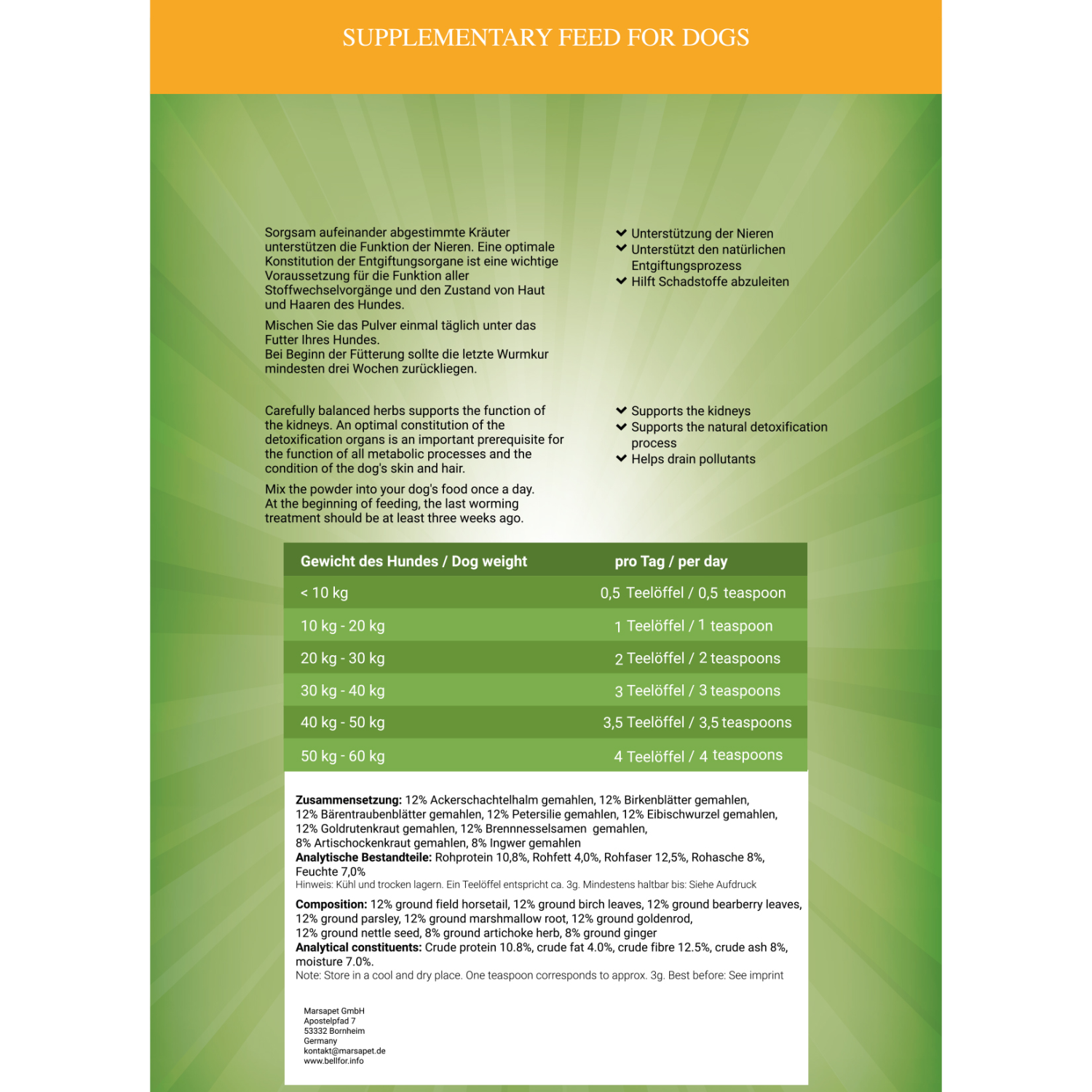 Urter som er nøye tilpasset hverandre i Bellfor Nierenkraft Pulver (nyrestyrkepulver), støtter funksjonen til hundens nyrer fra et ernæringsmessig synspunkt. En optimal sammensetning av avgiftningsorganene er det viktigste kravet for funksjonen til alle metabolske prosesser og tilstanden til hundens hud og hår.