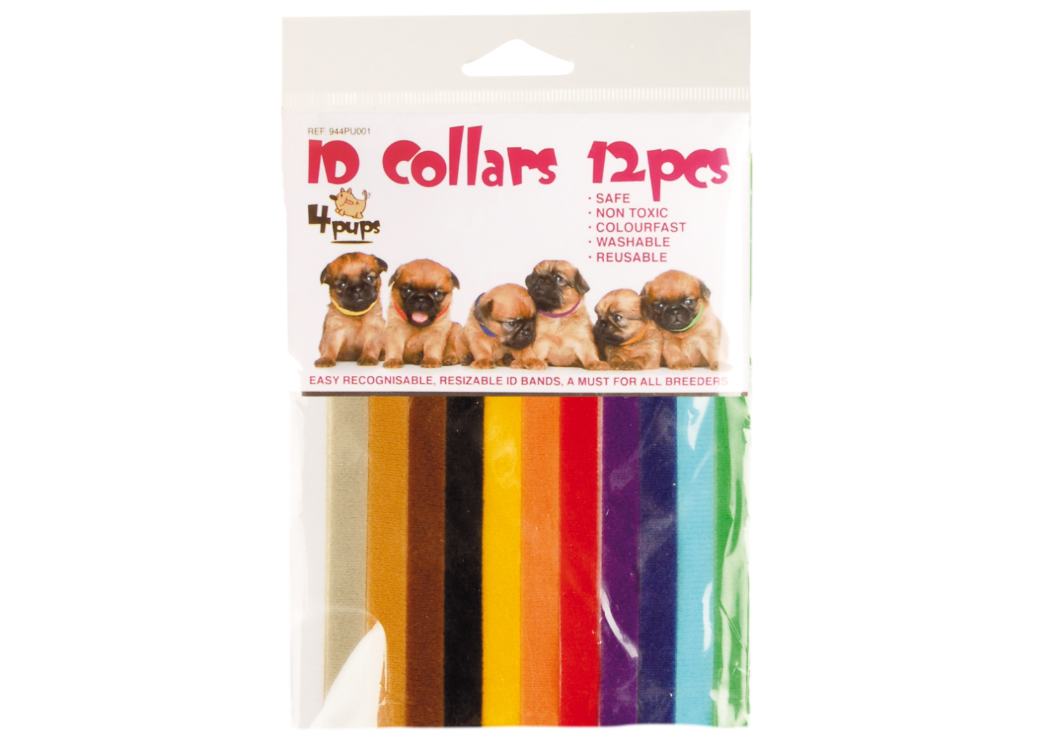 Smarte, smale, myke, vaskbare ID bånd til valpekull. Laget av fargebestandig ikke giftig velcro, gjenbrukbar. Onesize passer alle raser justerbart. Selges i pakning med 12 stk fargerike bånd.