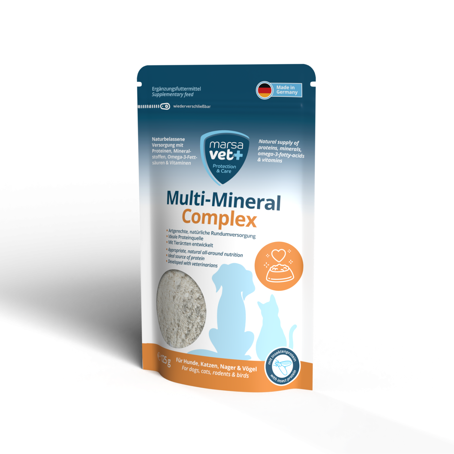 Det inneholder også insektprotein fra svart soldatflue, som er en proteinkilde av høy kvalitet.