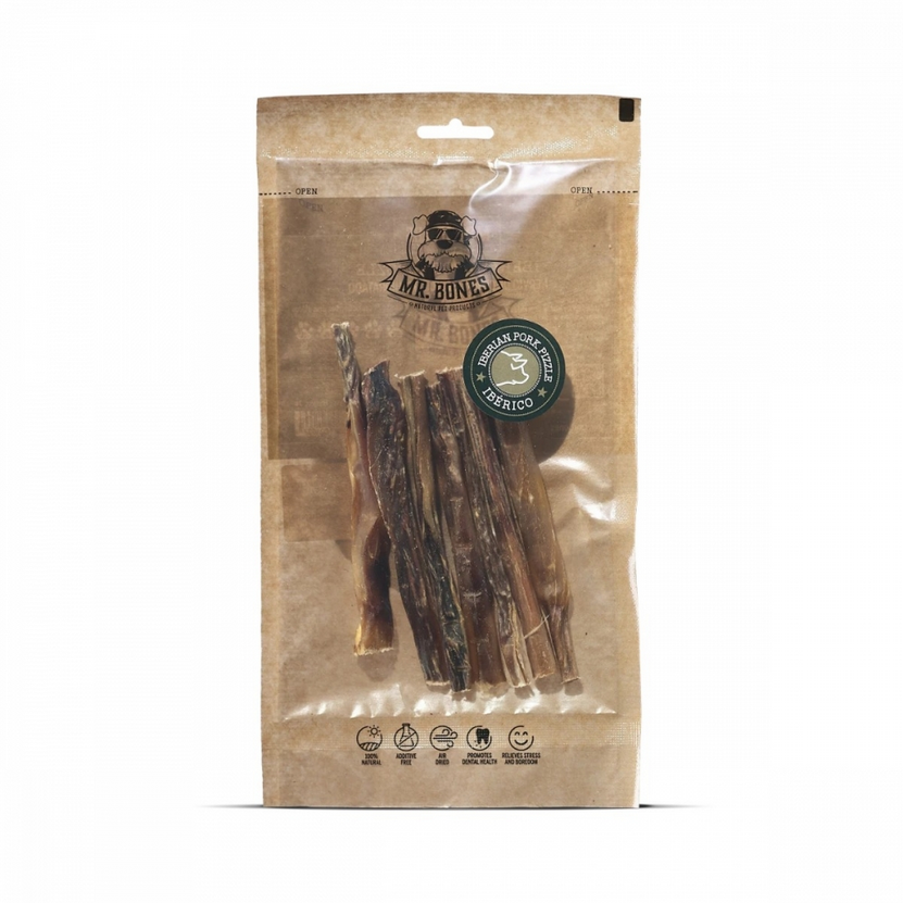 Mr.Bones 100 % luftørket grisemuskel er en sunn, ekte, naturlig og funksjonell snacks, som er svært velsmakende. Middels lav hardhet gir en lett og trygg snack, med intens smak. Pakket i pose med 7 enheter i på ca 14 cm.