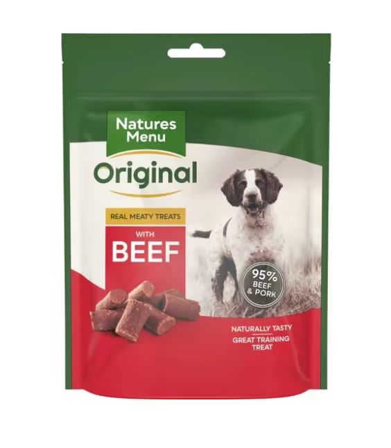 Natures Menu kjøttfulle godbiter er den ultimative treningsbelønningen. Laget med 95% ekte biff og svinekjøtt. En uimotståelig belønnings-godbit for hunder som ikke inneholder gluten.