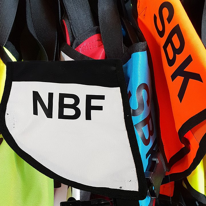 Tjenestetegn i bomull og bevernylon. Trykt NBF-tekst. Fast tryklås som holder strikken rundt magen på plass.