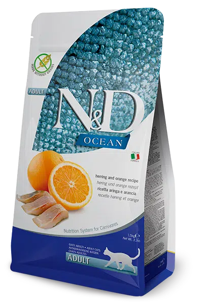 N&D Ocean Cat Adult Herring & Orange — premium hundefôr av høyeste kvalitet. Naturlige ingredienser, balansert næring og smak hunden elsker.