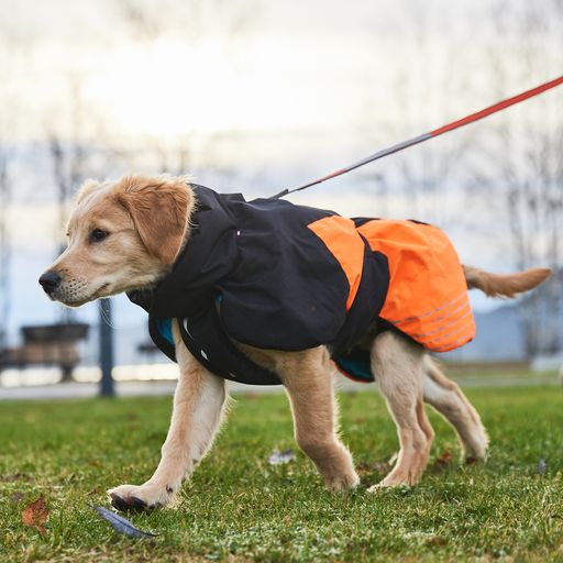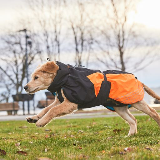 Vindtett ytterstoff, syntetisk dun-fôr og justerbare stropper som sikrer at jakken sitter under aktivitet. Oransje farge skiller seg ut mot snø, grønt og brunt — du ser hunden på lang avstand.