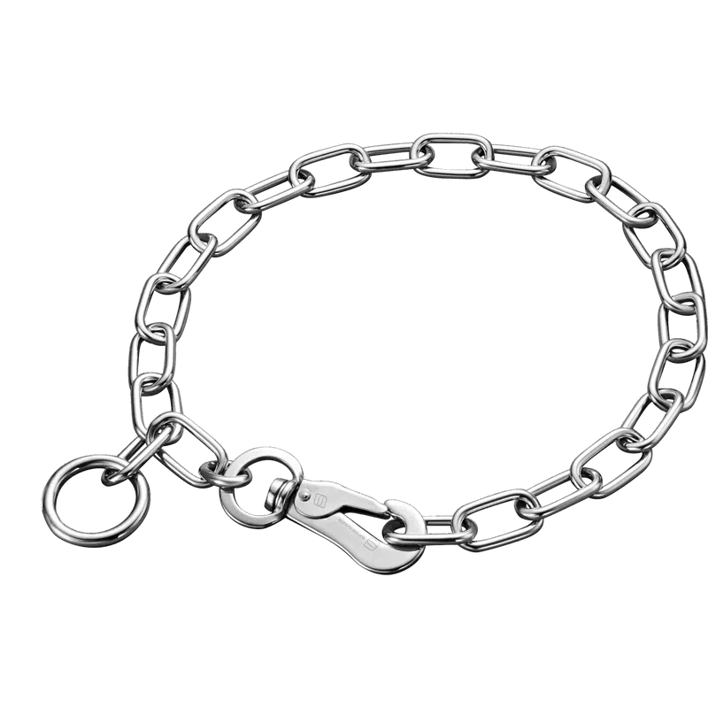 Dette halsbåndet har én ring og én sprenger-krok som gjør det mulig å variere lengden på kjedet og gir mulighet for trening uten grep.
