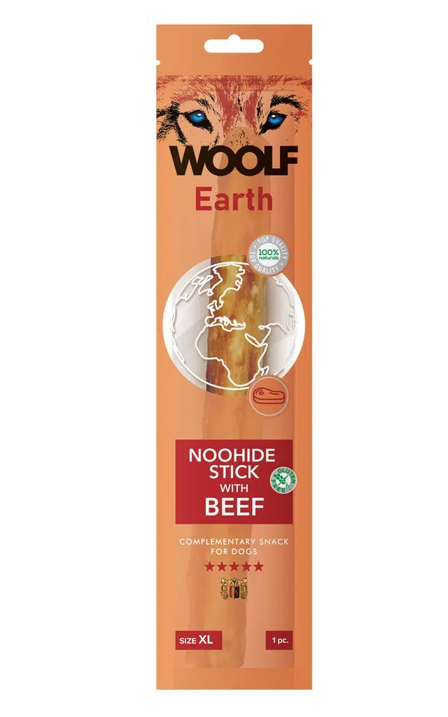 Noohide Earth Beef er et naturlig tyggeprodukt utviklet for å støtte god munnhygiene og tilby en smakfull tyggeopplevelse for hunden din med smaken av storfekjøtt. Woolf Earth Noohide er et sunt og naturlig tyggeprodukt for hunder, laget uten kunstige tilsetningsstoffer, konserveringsmidler eller korn. Perfekt for hunder med sensitiv mage. Inneholder gelatin fra oksehud og ben for en fast, men lettfordøyelig konsistens – kombinert med 20 % kjøtt for ekstra smak og næring. Noohide er myk nok for valper, men gir også voksne hunder et trygt og smakfullt alternativ til tradisjonell tygg – samtidig som det støtter tannhelsen.