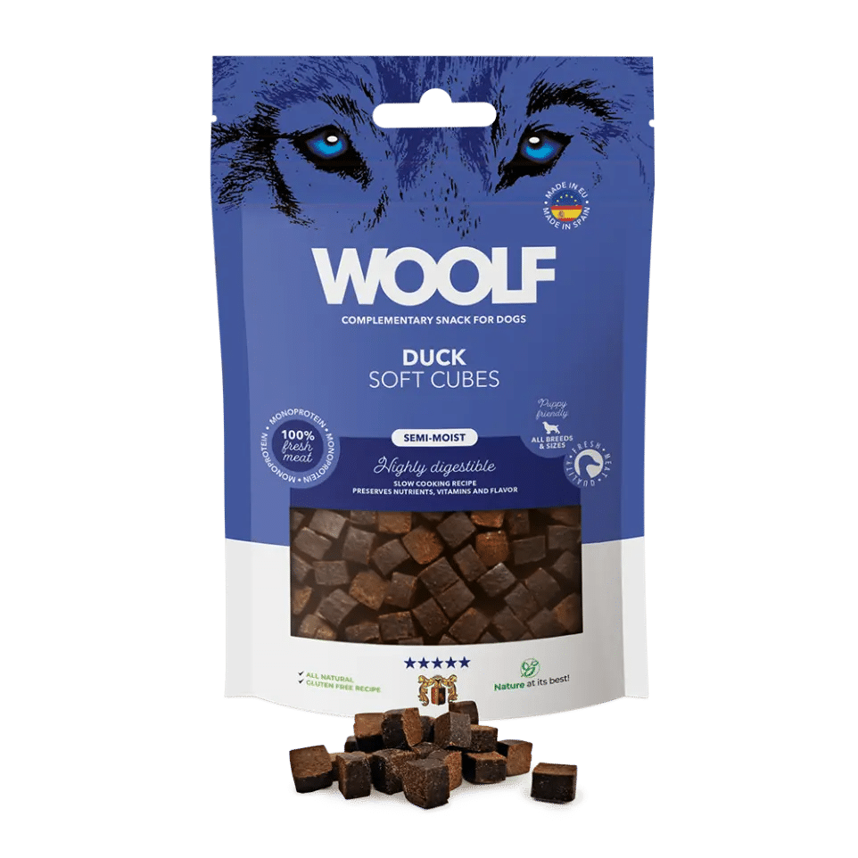 Woolf soft Cubes er en hundegodbit med en særegen semi-fuktig tekstur, utledet utelukkende fra naturlige ingredienser.