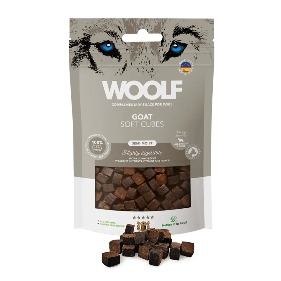 Woolf soft Cubes Goat er en m?onoprotein hundegodbit med en særegen semi-fuktig tekstur, utledet utelukkende fra naturlige ingredienser med en autentisk og naturlig smaksopplevelse. Geitekjøtt er magert og fullpakket med proteiner, ideelt for å støtte muskelvekst. Den milde smaken gjør den populær blant de fleste hunder og et et godt valg for hunder med allergier mot mer vanlig proteinkilder. Geitekjøtt er rik på essensielle mineraler som jern og sink
