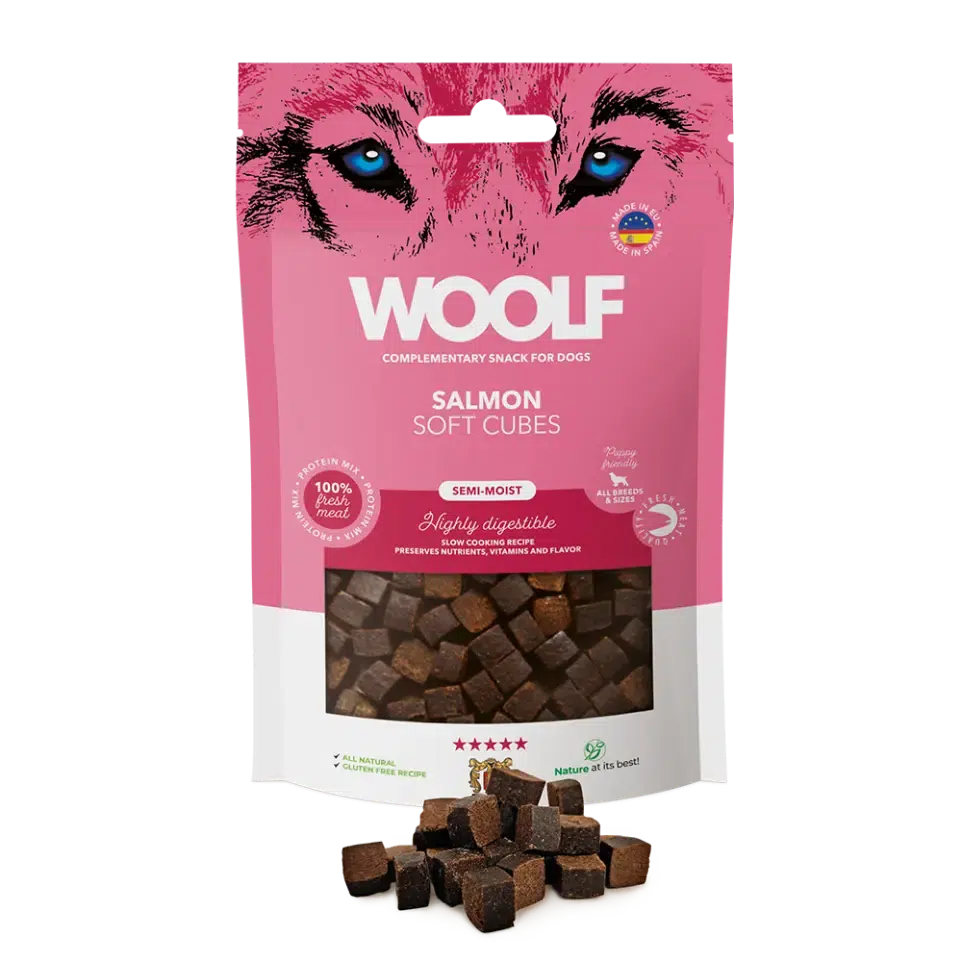 Woolf Soft Cubes Salmon 100gr er et snack til hund.